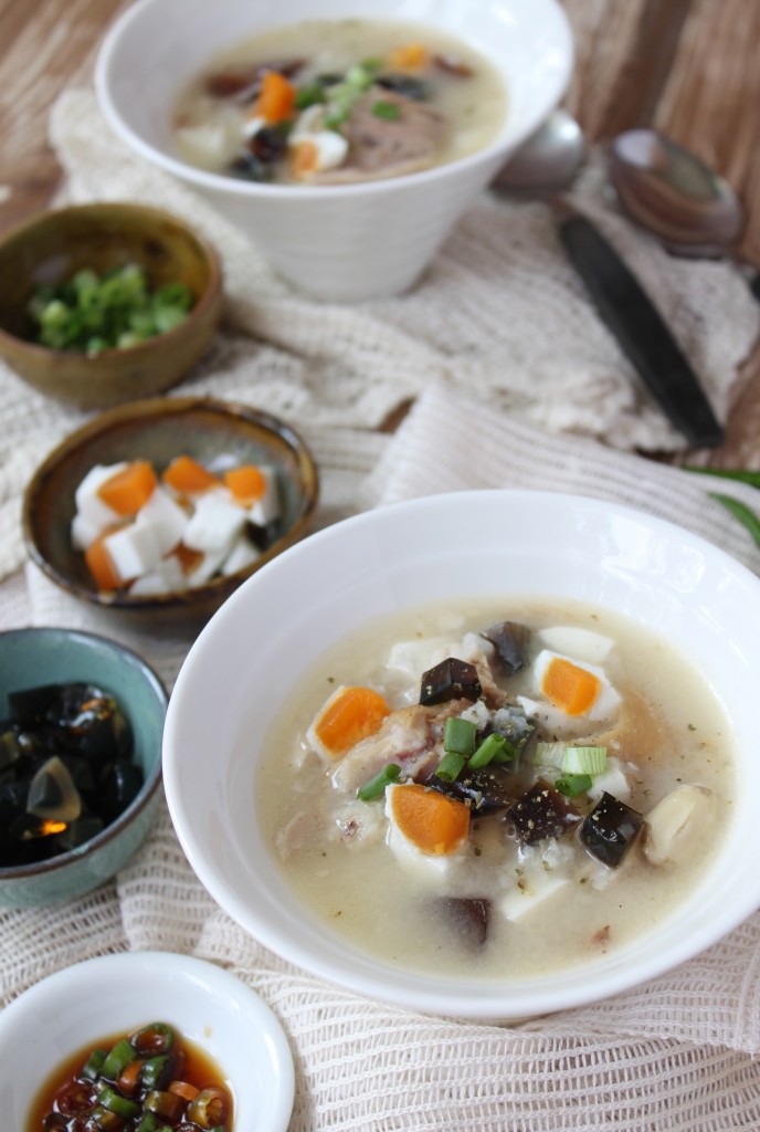 4. When congee is almost done, the texture of the congee is smooth and the pig trotters soft and gelatinous but still holding its shape.