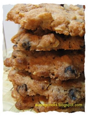 Here's a batch of semi-indulgence cookies after all those healthy muffins earlier! I called them 'semi' cos they have healthy oatmeal inside. Ha! who am I trying to deceive? I especially like these cookies with a hot cup of black coffee. Just one or two pieces will be enough to satisfy those little urges to snack on something crispy, chewy and partially sweet. Most recipes I tried earlier did not yield what I craved for. They are either too sweet, too soft for soft-baked, too burnt and not crispy and most of all, does not flatten when baked thus looking like a round bomb when it's done.